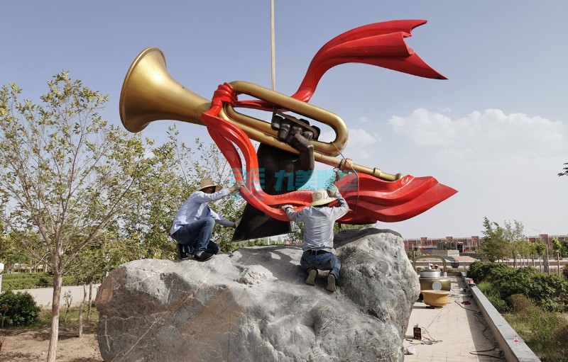 胜利的号角雕塑:以红军冲锋号为主体,手是铸铜工艺制作,其他部分为不锈钢锻造工艺制作。胜利的号角雕塑代表的不仅是战争的胜利,同时也是国家伟大事业的不断胜利。